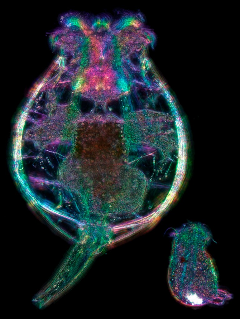 Female (left) and male (right) Brachionus manjavacas. Image taken with a polychromatic polarizing microscope. Photo credit: Michael Shribak and Kristin Gribble.